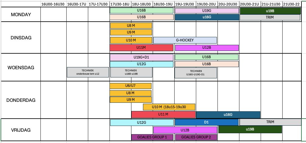U6: 9u-10u G-Hockey: 9u-10u U8: 9u-10u U9: 9u-10u U10: 10u-11u U11: 10u-11u U12B: 11u-12u U12G: 11u-12u U16G: 12u-13u15 U16B1: 13u15-14u30 U16B2: 14u30-15u45 U19G: 15:45-17u U19B: 17u-18u15 Dames: 18u15-19u30 Trim: 19u30-21u