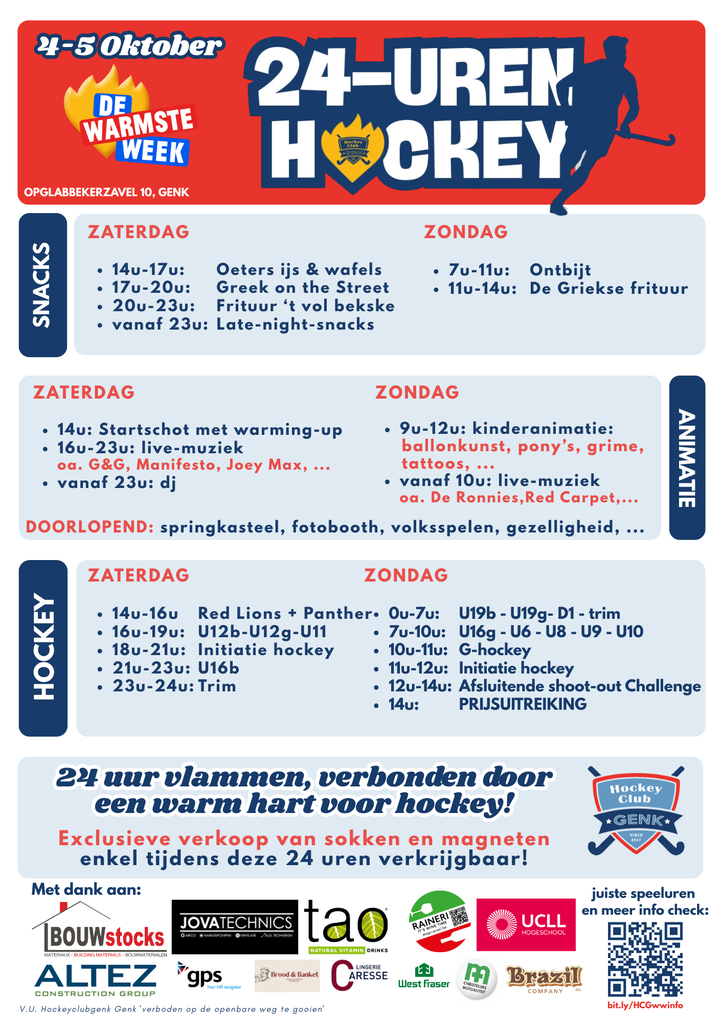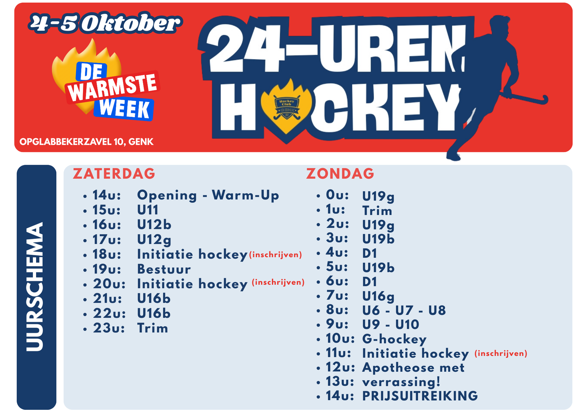 Ten voordele van de Warmste Week van Studio Brussel en VRT (www.dewarmsteweek.be) organiseert Hockeyclub Genk een 24-uren hockey-event op zaterdag 4 en zondag 5 oktober 2025. De Warmste Week staat dit jaar in het teken van mensen die onzichtbaar ziek zijn.